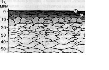 I — композиционное антифрикционное покрытие; 2 — переходная диффузионнаязона; 3 — деформированная(наклепанная) зона; 4 — основнойконструкционныйматериал