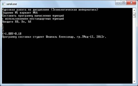 BEGIN;('Курсовая работа по дисциплине «Технологическая информатика»');('Задание №1 вариант №66');('Составить программу вычисления функций');('с использованием нестандартных функций');('Введите X0, Xn, hX');(X0, Xn, hX);