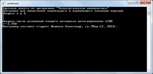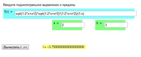 Y1:=SQRT(1-2*a+SQR(a))*SQRT(1-2*a+SQR(a))*(1-2*a+SQR(a))/(1-a);:=SQRT(1-2*b+SQR(b))*SQRT(1-2*b+SQR(b))*(1-2*b+SQR(b))/(1-b);:=0;:=a+h;:=Y+SQRT(1-2*x+SQR(x))*SQRT(1-2*x+SQR(X))*(1-2*x+SQR(x))/(1-X); X:=X+h;(X>=b-h);:=h*(0.5*(Y1+Yn)+Y);('I=', I:5:3); ('Программу составил студент Шешкиль Александр, гр.ТМбд-12, 2012г.');