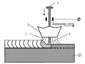 Рис. 9. Схема наплавки плавящимся электродом в среде защитных газов: 1 - поток защитного газа; 2 - сопло; 3 - плавящийся электрод; 4 - дуга.