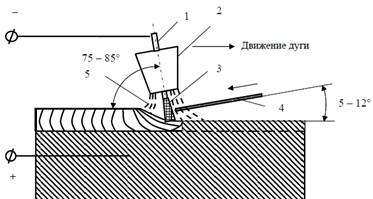 Рис.10. Схема наплавки вольфрамовым электродом: 1 - электрод; 2 - сопло горелки; 3 - дуга; 4 - присадочный материал; 5 - поток газа.