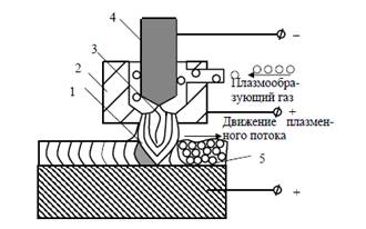 Рис. 11. Схема плазменной наплавки по порошковому слою: 1 - плазменный поток; 2 - сопло плазмотрона; 3 - дуга; 4 - стержневой электрод плазматрона; 5 - порошковый слой.