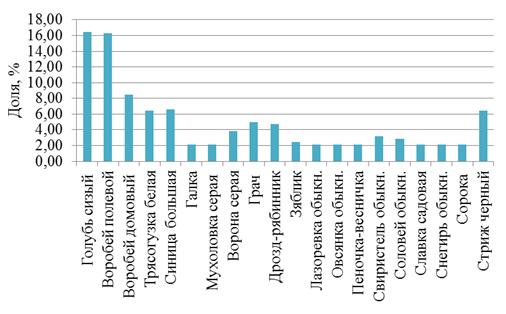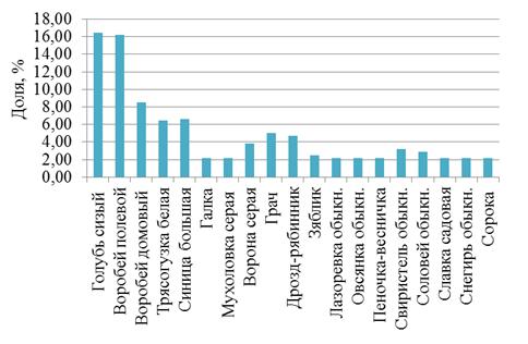 видовое разнообразие. Доминирующими видами являются воробей полевой и голубь