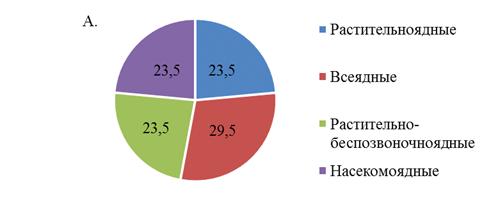 Разнообразие орнитофауны относительно одинаковое, что связано с разнообразием пищи. Высок процент всеядных и растительноядных птиц во все времена года. Группа всеядных птиц представлена большим количеством синантропных видов (рисунок 10).