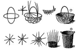 Сделав каркас корзины, начинают плести ее. Конец тонкого прута придерживают снаружи у основы, загибают внутрь корзины над нижним стояком, выводят снова наружу, над следующим стояком загибают снова внутрь и т.д. Прут огибает стояки поочередно то с одной, то с другой стороны и поэтому прочно держится между ними. На борту прут сгибают и продолжают плетение сверху вниз. Дойдя до основы, снова сгибают и ведут снизу вверх. Два соседних прута огибают каждый стояк с противоположных сторон. Когда прут кончается, конец его обрезают у одного из стояков "на ус", прикладывают к срезу нового прута и продолжают плетение. Сращивать прутья следует не у основы и не у бортов корзины, а в промежутках между ними. [38]