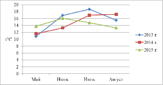 Выявлена тенденция снижения видового разнообразия и уловистости жужелиц с 2013 года по 2015 год (соответственно, 16 видов, 2,15 экз./10 ловушко-суток и 8 видов, 0,21 экз./10 ловушко-суток). Это объясняется динамикой погодных условий (рисунок 2, рисунок 3).