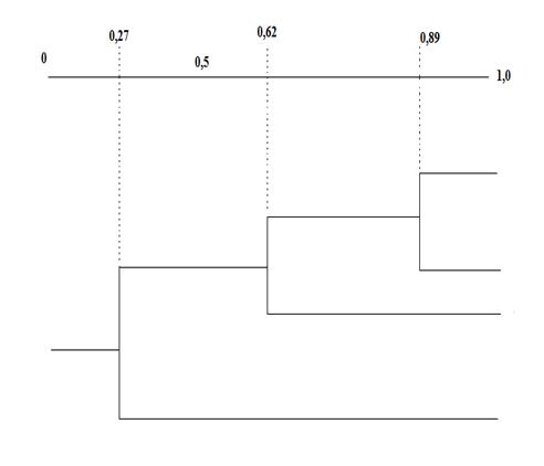Для сравнения населения жужелиц различных типов местообитаний по видовому составу использовался коэффициент Жаккара (рисунок 6). Наибольшим видовым сходством жужелиц обладаю ельник-зеленомошный и разнотравный луг (0,89), это связано с тем, что линии ловушек Барбера на разнотравном лугу были распложены близко к ельнику, и лесные виды могли проникать на луг. Например, на лугу были зарегистрированы такие типично лесные виды как Pt. oblongopunctata, Pt. niger, Cl. melanocephalus. Наименьшей уникальностью видового состава жужелиц обладает приусадебный участок (0,27). Это связано со специфическими условиями этого участка благодаря влиянию хозяйственной деятельности.
