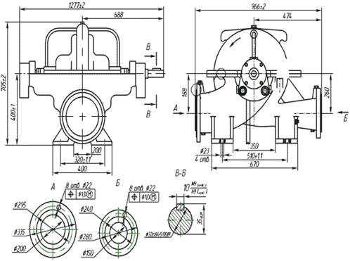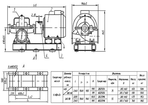 Насосы типа НДв, НДс - центробежные, горизонтальные, одноступенчатые с двусторонним полуспиральным подводом жидкости к рабочему колесу и спиральным отводом (Таблица 1.1). Корпус насоса имеет разъем в горизонтальном плоскости. Всасывающий и напорный патрубки выполнены в нижней части корпуса, что позволяет проводить разборку насоса для замены деталей ротора без отсоединения трубопровода и демонтажа двигателя.
