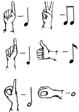 Під час технічних вправ можна використовувати також деякі ручні знаки, що показують ритмічні одиниці.