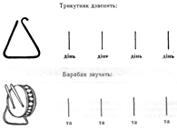 Цей ритмічний рисунок відтворює спочатку весь клас, потім окремі учні. Він може бути виконаний на різних ударних інструментах.