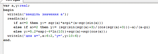 Мета роботи: Вивчення структури програми на Паскалі. Вивчення операцій введення-виведення. Оволодіння навичками записування виразів і використанні стандартних функцій. Використання умовних операторів.