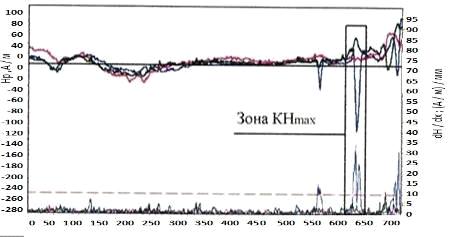 На оси абсцисс представлена шкала длинны в миллиметрах, характеризующая длину участка контроля и предназначенная для определения точных координат участка (зоны) изменения градиента магнитного поля. На оси ординат обозначено распределение магнитного поля (значение градиента магнитного поля). Классификация дефектов (напряжений) по критерию годности к эксплуатации выполняется исходя из значения градиента магнитного поля dH / dx. Распределение магнитного поля Н и его градиента dH/dx характеризует фактическое напряженно-деформированное состояние сварного стыка и околошовной зоны. Зона резкого изменения значения градиента dH / dx, превышающего допустимое значение свидетельствует о наличии зоны концентрации напряжений (ЗКН max) в координатах 620-660 мм.