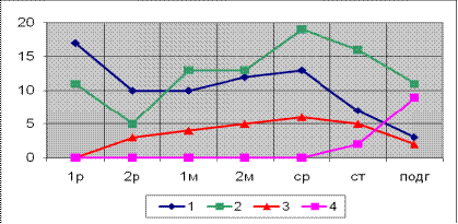 Из диаграммы 1, видно, что задачи всех уровней представлены в каждой из возрастных групп, но их соотношение различно. Таким образом, учитывается возрастной принцип. Так, например задачи 3 и 4 уровня, появляются в полной мере лишь в старших групах, так как,являются наиболее сложными, и появляются позже всего. Помимо возрастного принципа, программа учитывает также принцип концентрического построения материала, по становлению пространственных представлений. Так как, задачи всех иерархических уровней, на разных возрастных этапах имеют разную степень сложности, а именно: расширяються, обогащаються и уточняются.