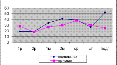Из диаграммы 2 видно, что косвенные и прямые задачи, представлены в равном соотнощении. Разницами между данными группами задач в подготовительной группе, связана с особенностями анализа, так как задачи являющиеся основными для первого уровня, прослеживаются на протяжении всего дошкольного преиода, и в подготовительной группе становятся базовыми для более сложных форм пространственных представлений. Причем большее количество прямых задач по формированию пространственных представлений решается в образовательных областях «Физическая культура» и «Познание». Косвенные же задачи, в своем большинстве представлены в разделах «Художественное творчество», «Социализация», «Музыка» и отностяся главным образом к продуктивной деятельности детей.