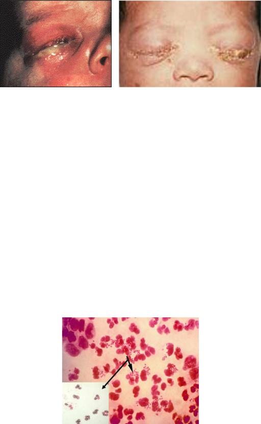 неонатальная гонококковая инфекция). Офтальмия (бленнорея) новорожденных обнаруживается у ребенка на 2-3 день после родов. Вначале она проявляется водянистыми желтоватыми выделениями из глаз. Через сутки отмечается сильная отечность и покраснение век, а выделения становятся мутными. Еще через 4-5 дней краснота век уменьшается, выделения приобретают гнойный характер (рисунок 41).