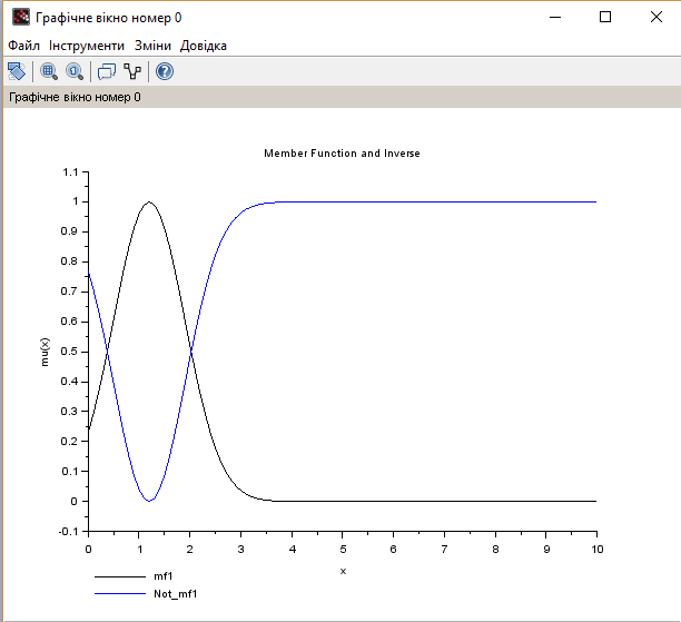 plot2d(x,[y1 y2],leg='mf1@Not_mf1',rect=[0 -0.1 10 1.1]);