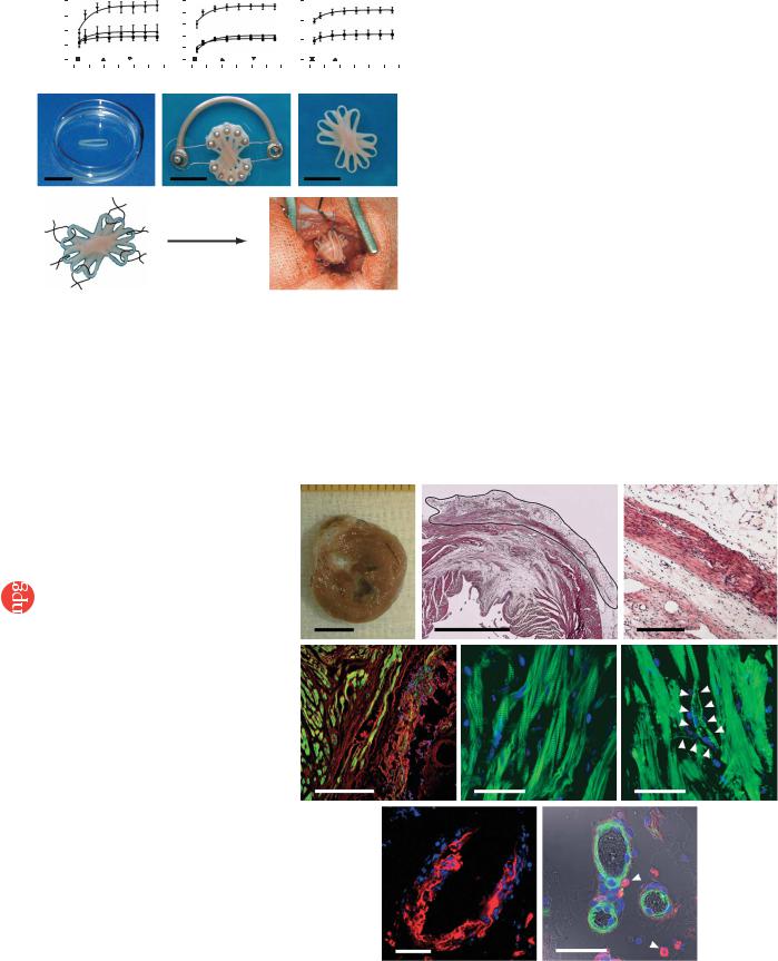 complete replacement of diseased myocardium or reconstitution of cardiac malformations. However, cardiac tissue engineering is still in its infancy for several reasons. (i) Postnatal cardiomyocytes do not or do not sufficiently replicate. Thus, large-scale tissue engineering will require alternative cell sources. (ii) To repair myocardial infarctions or correct heart defects, heart tissue patches need to be engineered at a size and with contractile features that can lend considerable support to failing hearts. Size, as well as function and in vivo survival, depend crucially on metabolic supply. Thus, vascularization is a prerequisite for successful creation and survival of engrafted large cardiac tissue patches. (iii) The heart not only needs systolic strength, but depends on unimpeded diastolic relaxation. Consequently, engineered heart muscle must have a large compliance. (iv) Any successful tissue engineering concept will depend on structural and electrical integration of implanted tissue into the host myocardium. Although recent progress in stem cell research has opened new perspectives for cell sourcing (for example, from embryonic18 or adult stem cells13,19,20), the other conceptual challenges remain.