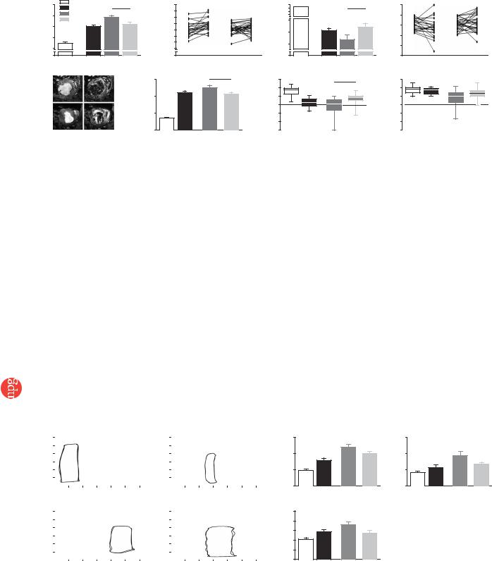 MRI (Fig. 4e–h) supported the echocardiography data, showing smaller left ventricular volumes in EHT-grafted rats when compared to sham-operated rats (Fig. 4f). Moreover, MRI-recorded AWThF was markedly better in EHT-grafted rats when compared to sham-oper- ated rats (Fig. 4g). PWThF was not affected (Fig. 5h). In the group of rats that received noncontractile grafts (Supplementary Tables 2–4 online), AWThF was similar to sham-operated and myocardial infarction baseline values.