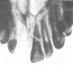 2)вывихом зуба, при котором контуры зуба не нарушены, но отмечается расширение периодонтальной щели вокруг всего корня или на отдельных его участках и сужение на других (при вколоченном вывихе периодонтальная щель на рентгенограмме отсутствует, а при переломе ширина ее не изменена);