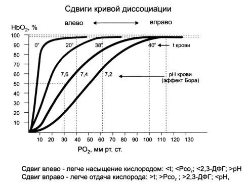 Избыток СО2 и ацидоз сдвигает кривую диссоциации вправо, а недостаток СО2 и алкалоз – влево(эффект Бора). В легких реакция взаимодействия гемоглобина с кислородом идет в сторону образования оксигемоглобина, т.к. венозная кровь имеет напряжение кислорода 40 мм рт. ст., а в альвеолярном воздухе парциальное давление кислорода составляет 100 мм рт. ст.