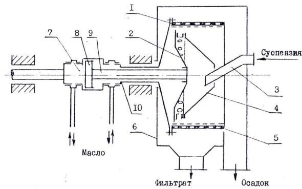 Внутри перфорированного ротора 1 по его оси размещен пор- шень-толкатель 2. Суспензия по трубе 3 поступает в коническую воронку 4, вращающуюся синхронно с ротором, на внутренней поверхности которого находится металлическое щелевое сито 5. Через отверстие в воронке суспензия поступает в ротор. Под действием разности давления, возникающей за счет вращения ротора, жидкость проходит через сито и через отверстия в стенке ротора и удаляется из кожуха 6 через сливной патрубок. Твердые частицы, которые задерживаются на сите в виде осадка, периодически порш- нем-толкателем перемещаются к открытому концу барабана и выгружаются в кожух. Движение поршня-толкателя осуществляется за счет подачи масла в цилиндр 7, где находится поршень 8, который через шток 9, проходящий внутри полого вала 10, связан с поршнемтолкателем. Попеременная подача масла в правую или левую полости цилиндра обеспечивает возвратно-поступательное движение поршнятолкателя.