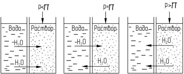 а– осмос; б – равновесие; в – обратный осмос
