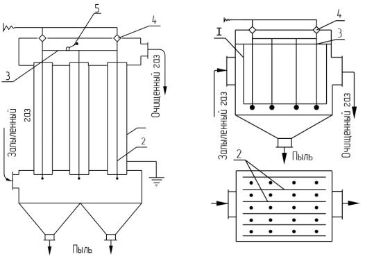 Запыленный газ (см. рис. 2.33) поступает в нижнюю часть аппарата и распределяется по трубчатым электродам 1 (аноды), внутри которых расположены коронирующие электроды 2 (катоды) в виде стержней. Катоды подвешены на общей раме 3, которая опирается на изоляторы 4. Твердые частицы, которые осаждаются на аноде, периодически стряхиваются ударным приспособлением 5 и удаляются из нижней части аппарата.