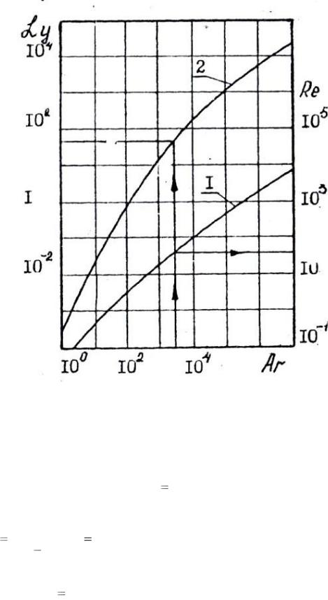 1 – Re = f (Ar); 2 – Lу = f (Ar)