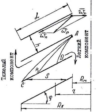 Влиянием вращения барабана на траекторию движения жирового шарика пренебрегаем. Предположим, что в начальный момент жировой шарик находится в точке А (см. рис. 2.13). Шарик с потоком молока будет переноситься вдоль зазора со скоростью wп, а под действием центробежной силы – пересекать поток в горизонтальном направлении со скоростью wo. В результате этих двух движений шарик со скоростью wp будет двигаться по криволинейной траектории к наружной поверхности нижерасположенной конической тарелки (например АВ, AD, АС). Следовательно, вдоль наружной поверхности тарелки будет двигаться к оси вращения легкий компонент, а вдоль внутренней поверхности к периферии – тяжелый компонент.