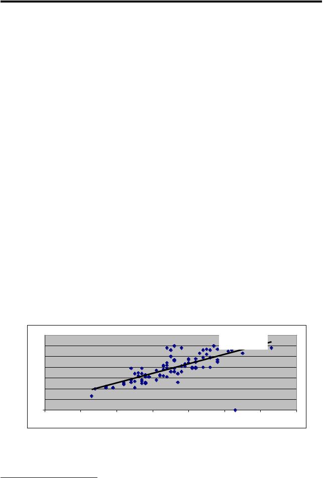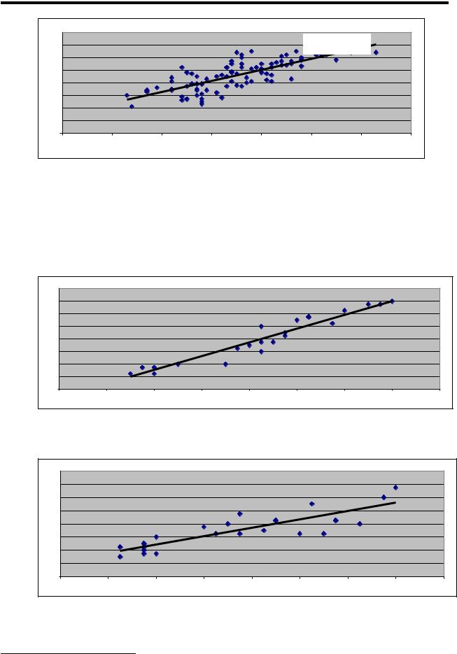 Если графический анализ охватывает исключительно данные для стран с переходной экономикой, уровень корреляции возрастает с 50 до 92 % для законодательства, и с 59 до 75 % для права собственности (см. рис. 5 и рис. 6)1.