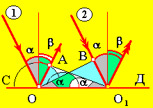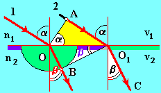 то за t прохождения падающей плоской волной расстояния АО1 в первой среде АО1 = v1t. Фронт вторичной волны достигает точек полусферы, радиус которой ОВ = v2t. Новый фронт волны, распространяемой во второй среде, изображается плоскостью ВО1, а направление ее распространения лучами ОВ и О1С (перпендикулярными к фронту волны). Угол между лучом ОВ и |
