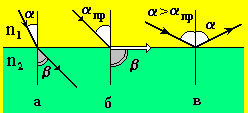 Согласно закону преломления на границе раздела двух сред можно наблюдать полное внутреннее отражение, если n1 > n2, т. е. > . Следовательно, существует такой предельный угол падения пр, когда = 900. Тогда закон преломления принимает следующий вид: