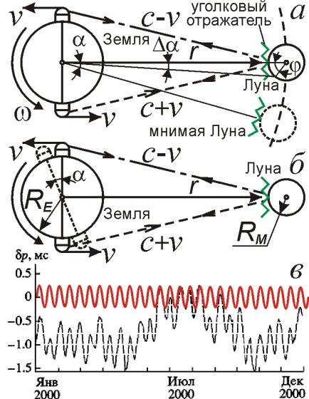 Неучтённая вариация скорости света создаёт иллюзию сдвига или поворота Луны (а), Земли (б) и вариации суток (в).