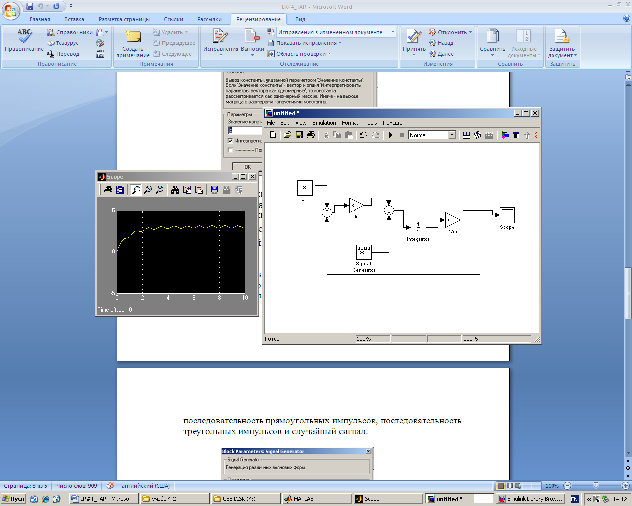С помощью среды Simulink и система Matlab было исследовано влияние параметров m и k, и определено минимальное отклонение разности между откликом модели и измеренным откликом реального объекта на одном и том же входном сигнале. Так же была обнаружена зависимость отклонения от величины коэффициентов, чем больше значение коэффициентов, тем меньше значение отклонения.