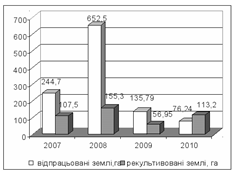 За даною діаграмою стану порушених і рекультивованих земель динаміка росту відпрацьованих земель з періоду 2007 по 2008 зросла на 36,6%, а рекультивованих земель зросла лише на 14%, в період з 2008 по 2009 рік ріст відпрацьованих земель порівняно з 2008 року знизився на 40%, а також на цей період знижується площі рекультивованої землі з 2009 році порівняно з 2008 роком на 36%, на період з 2009 по 2010 площі відпрацьованих земель порівняно з 2009 роком знизились на 11%, а площі рекультивованих земель майже 50%.