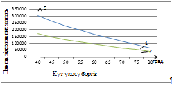 Значення ліній 1 - показник необхідного об’єму відходів при глибині кар’єру 40 м в залежності від кутів укосу бортів.