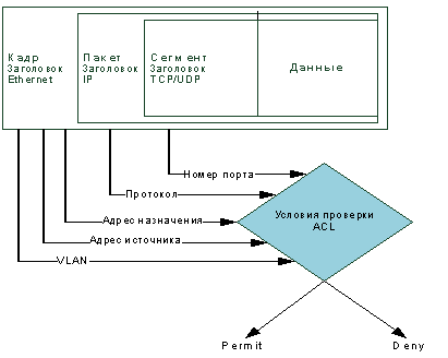 Списки контроля доступа являются средством фильтрации потоков данных без потери производительности, так как проверка содержимого пакетов данных выполняется на аппаратном уровне. Фильтруя потоки данных, администратор может ограничить типы приложений, разрешенных для использования в сети, контролировать доступ пользователей к сети и определять устройства, к которым они будут подключаться. Также ACL могут использоваться для определения политики качества обслуживания (QoS) путем классификации трафика и переопределения его приоритета.представляют собой последовательность условий проверки параметров пакетов данных. Когда сообщения поступают на входной порт, коммутатор проверяет параметры пакетов данных на совпадения с критериями фильтрации, определенными в ACL, и выполняет над пакетами данных одно из действий: Permit (Разрешить) или Deny (Запретить). Критерии фильтрации могут быть определены на основе следующей информации, содержащейся в пакете (см. рисунок 7):