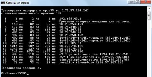 Результат выполнения tracert зависит от точки, через которую осуществляется подключение к сети Интернет, но в начале и в конце указывается IP-адрес сервера: npvo35.ru (Рисунок 4).