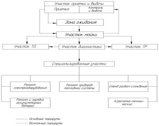 После приёмки автомобиль направляется на соответствующий производственный участок. При этом работы текущего ремонта предшествуют работам технического обслуживания. В случае занятости рабочих постов, на которых должны выполняться работы согласно заказ-наряд, автомобиль поступает в зону ожидания, а оттуда по мере освобождения постов направляется на тот или иной производственный участок. После завершения работ автомобиль поступает на участок выдачи.
