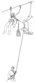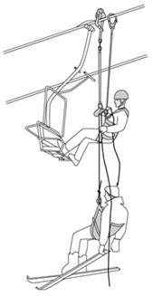 1. Поднявшись по опоре до несущего каната, спасатель добирается по нему до кресла с использованием ролика и большого крюка для страховки; скорость его перемещения регулирует при помощи веревки спасатель, находящийся внизу;