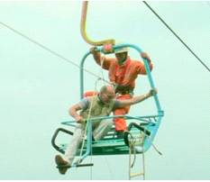Эвакуация с канатной дороги. Спасатель находится на тросе.