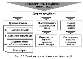 Оцінка фінансових вкладень здійснюється у двох випадках: при безпосередньому придбанні фінансових інвестицій та в разі складання фінансової звітності. Оцінка, що проводиться при безпосередньому придбанні фінансових інвестицій, називається первісною оцінкою; а та, що здійснюється в разі складання фінансової звітності - оцінкою на дату балансу.