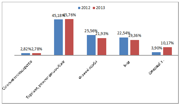 Райффайзен Банк Аваль надає такі види довгострокових кредитів як кредит на операції з нерухомим майном, будвництво тощо. Аналізуючи дані 2013 та 2012 років, видно що у 2013 році частка виданих кредитів на такий вид економічної діяльності фактично не змінилася. (Рис.2.7.).