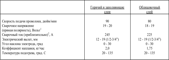 РЕКОМЕНДУЕМЫЕ РЕЖИМЫ СВАРКИ ГОРЯЧЕГО, ЗАПОЛНЯЮЩИХ И ОБЛИЦОВОЧНЫХ ПРОХОДОВ ПРОВОЛОКОЙ NR-207, 207H, 208H 5/64” (2,0 мм)