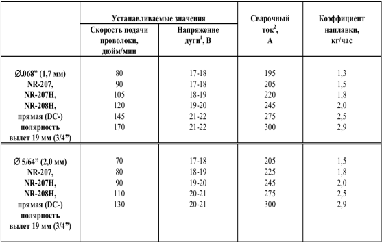 ДИАПАЗОН РЕЖИМОВ СВАРКИ ПРОВОЛОКОЙ INNTRSHIELD NR-207, 207H, 208H 0,068” (1,7 мм) и 5/64” (2,0 мм)
