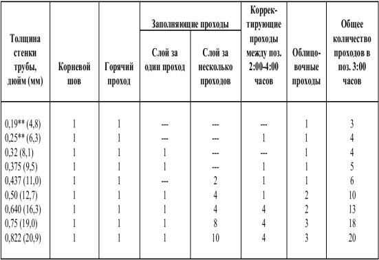 ПРИБЛИЗИТЕЛЬНОЕ КОЛИЧЕСТВО ПРОХОДОВ ПРИ СВАРКЕ СТЫКОВ ТРУБ РАЗЛИЧНОЙ ТОЛЩИНЫ
