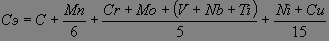 где С (углерод), Mn (марганец), Сr (хром), Мо (молибден), V (ванадий), Ti (титан), Nb (ниобий), Cu (медь), Ni (никель) - массовые доли соответствующих элементов, входящих в обозначение марки стали. Химический состав и эквивалент по углероду принимают по документу о качестве завода-поставщика металла.