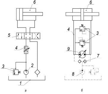 - гидробак; 2 - нерегулируемый насос; 3 - предохранительный клапан; 4 - регулируемый дроссель; 5 - распределитель; 6 - гидроцилиндр; 7 - обратный клапан; 8 - насос подпитки; 9 - регулируемый насос