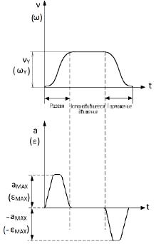 Процесс перемещения механизмов станков состоит, как правило, из следующих этапов: разгон от скорости, равной 0, до скорости установившегося движения; перемещение со скоростью установившегося движения νу (ωу) и замедление скорости (торможение) перед остановкой в конечном положении или переходом на меньшую скорость рабочей подачи (рисунок 2.1).