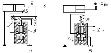 При управлении торможением по пути (рисунок 2.2 а) процесс торможения начинается после воздействия кулачка 1, установленного на штоке ГЦ (2) или на валу ГМ, на ролик 3 УГУ; золотник 4, перемещаясь вниз, перекрывает проход жидкости, вытесняемой из полости 5.